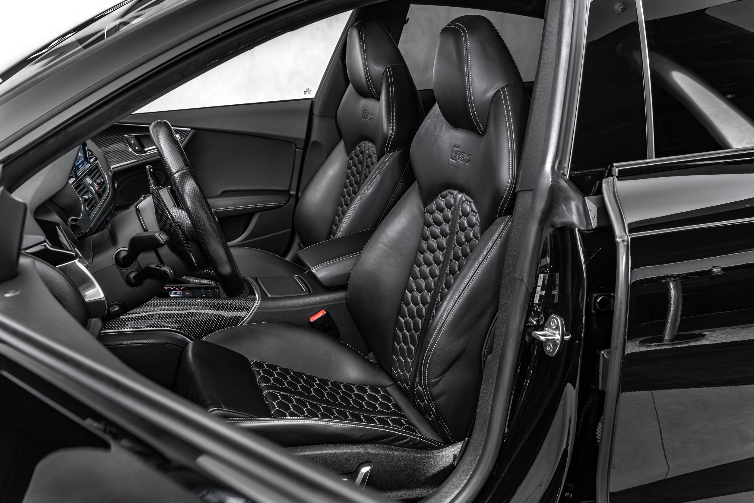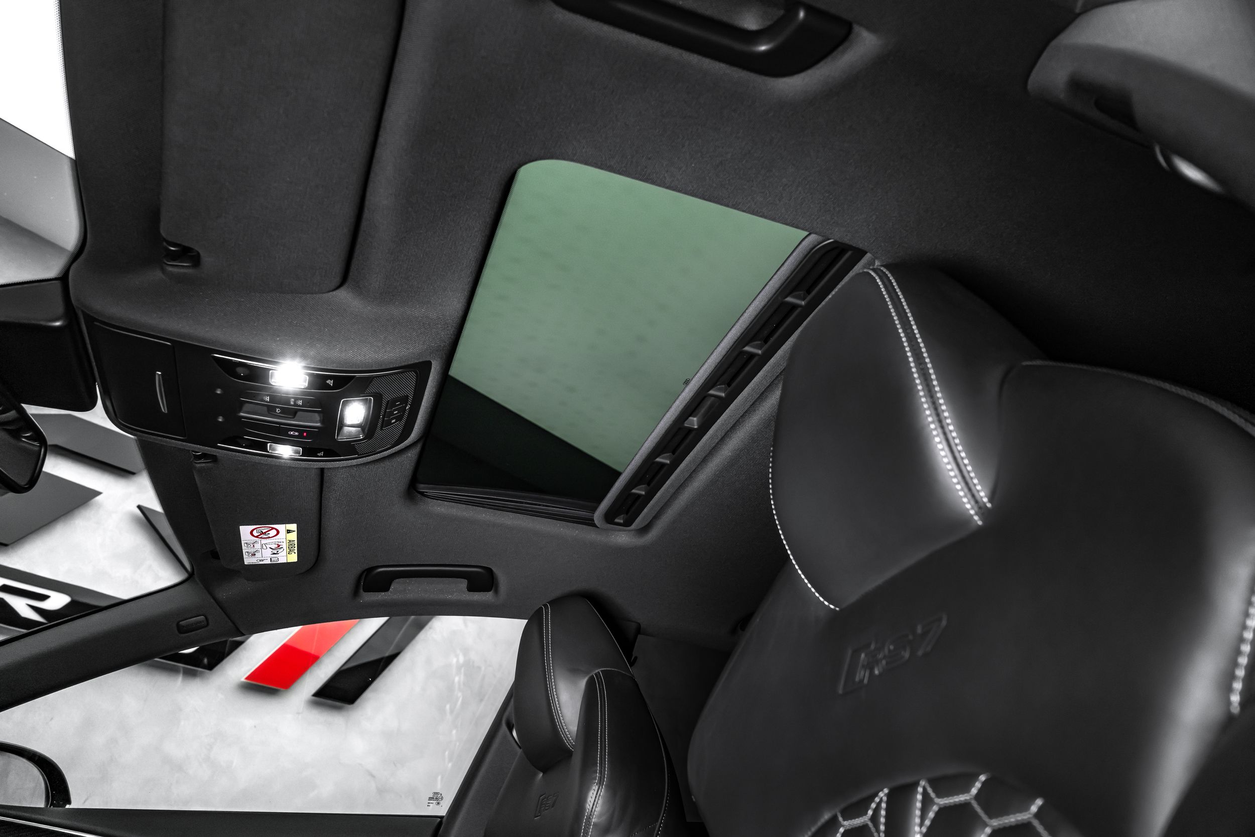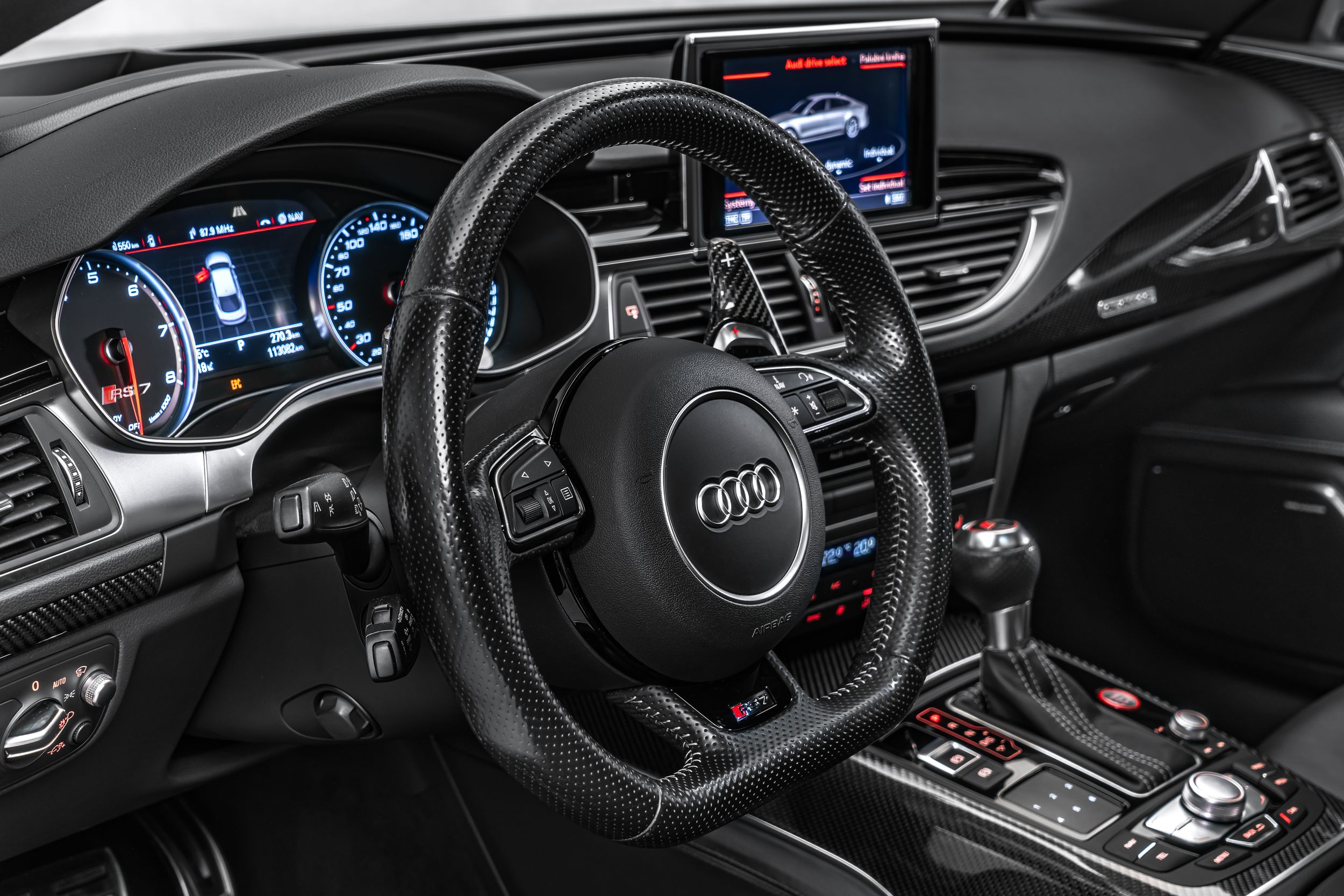 Akustická skleněná boční okna, tažné zařízení s asistentem pro přívěs, balíček parkovacích asistentů s dálkovým parkovacím asistentem, balíček asistenčních služeb ve městě, klíč Audi connect, rozhraní pro chytrý telefon Audi, elektricky nastavitelná vnější zpětná zrcátka. Nastavitelná, vyhřívaná a sklopná vnější zpětná zrcátka s automatickým stmíváním a pamětí, handsfree systém Bluetooth s rozpoznáváním hlasu (Audi Phone Box), čalounění stropu z Alcantary, čalounění stropu z mikrovlákna Dinamica, černá barva, černé střešní lyžiny, zámky kol, DVD mechanika, paket Dynamic Plus, systém ochrany cestujících na zadních sedadlech Audi pre sense, asistent nočního vidění, vyhřívané akustické čelní sklo, head-up displej, karbonové keprové obložení interiéru, rozšířené kožené prvky interiéru, úchyty Isofix pro dětské sedačky na sedadle spolujezdce, keramické brzdy vpředu a vzadu, modře lakované brzdové třmeny, digitální přístrojový panel (virtuální kokpit plus) s designem RS, světlomety Matrix LED, hliníkový stylingový paket Matný lak, systém pneumatik Performance, sportovní výfukový systém RS, integrovaný vysílač otevírání garážových vrat, centrální zavírání dveří, odvětrávaná a masážní přední sedadla, perforované kožené čalounění Valcona s voštinovým prošíváním a odvětráváním, mechanická sluneční clona pro zadní okno a elektrická sluneční clona pro zadní boční okna, audiosystém Bang & Olufsen, nezávislé topení, RS nárazníky, kompletní lakování, digitální televizní a rádiový příjem (tuner), dva nabíjecí porty USB typu C pro cestující vzadu, tónovaná skla v zadních oknech.