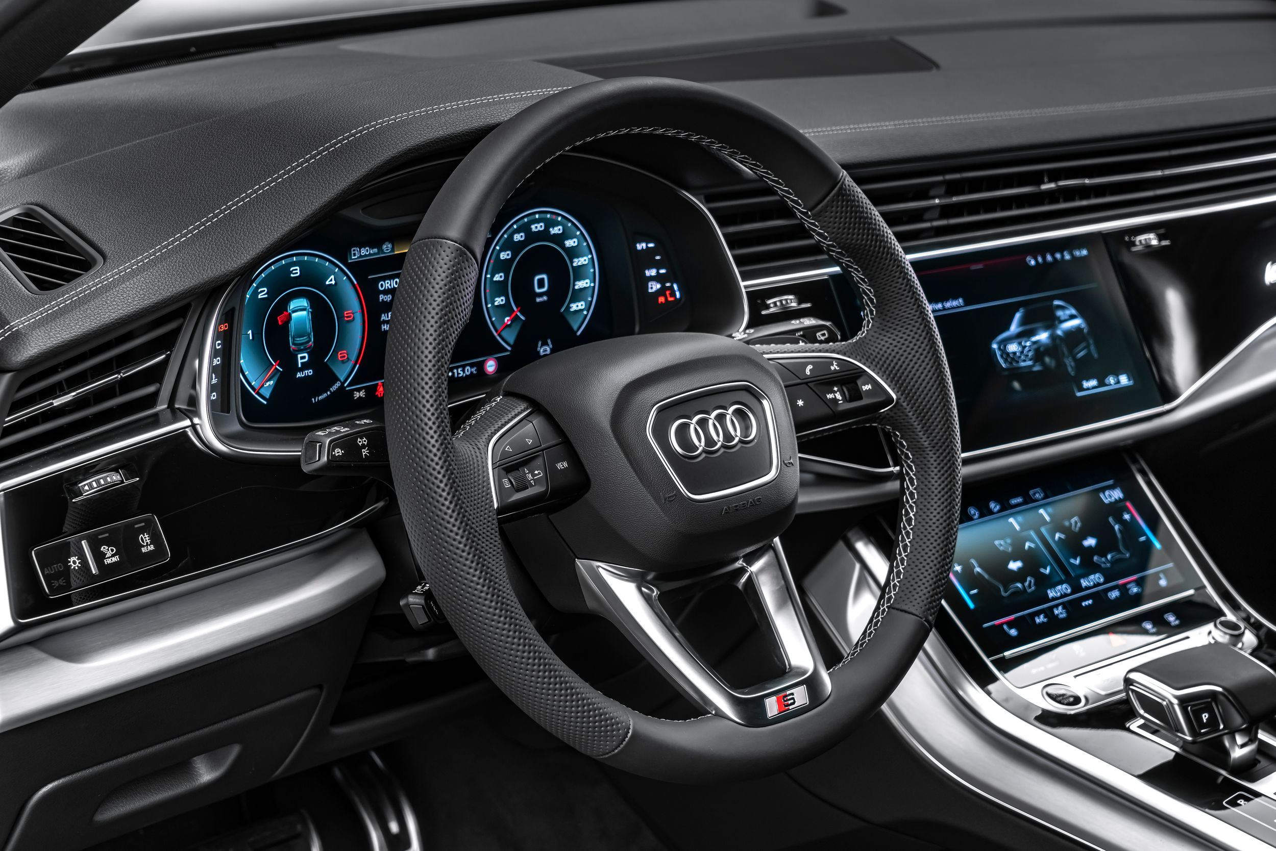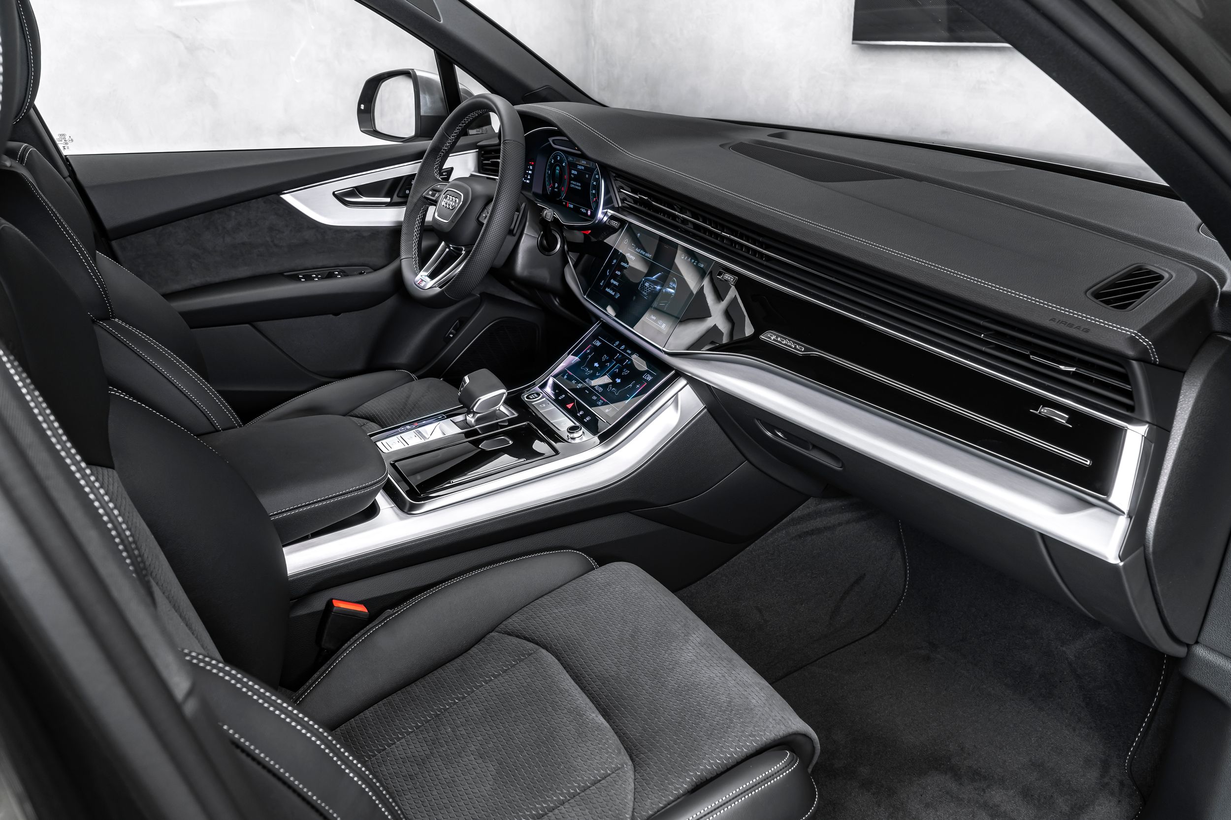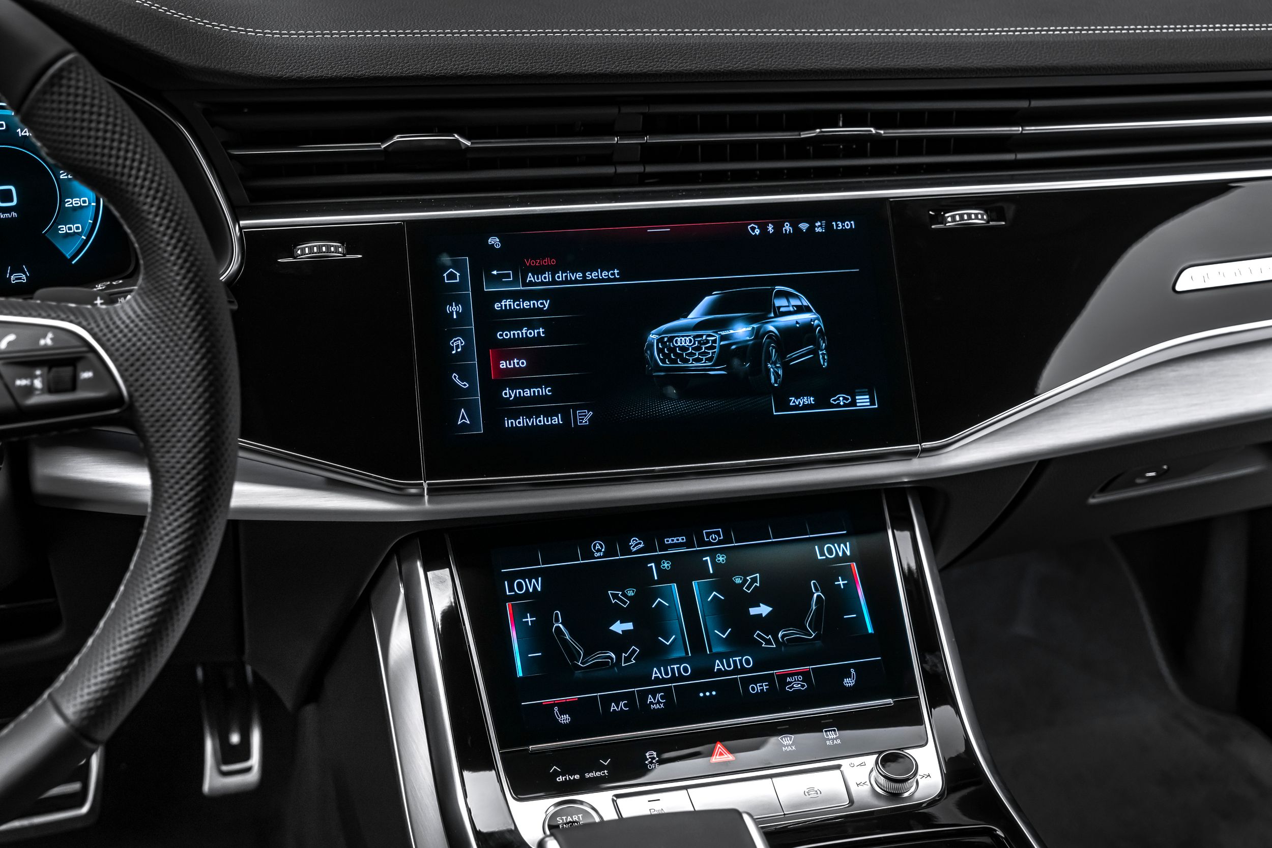 Řízení všech kol, sada parkovacích asistentů s dálkovým parkovacím asistentem, sada cestovních asistentů, klíč Audi connect, rozhraní pro chytré telefony Audi, elektricky nastavitelná vnější zpětná zrcátka. Nastavitelná, vyhřívaná a sklopná vnější zpětná zrcátka s automatickým stmíváním a pamětí, černé látkové čalounění stropu, hliníkové střešní nosiče, zamykání kol, asistent pro změnu jízdního pruhu (Side Assist) včetně Audi pre sense rear, adaptivní vzduchové odpružení, HD Matrix LED světlomety, head-up displej, individuálně nastavitelná sedadla vpředu, interiérové ​​obložení: hliníkové dekorační vložky Spectrum, úchyty Isofix pro dětské sedačky na sedadle spolujezdce, 4zónová automatická klimatizace, digitální přístrojový panel (virtuální kokpit plus), komfortní klíč se senzorovým otevíráním víka zavazadlového prostoru (otevírání + zavírání), paket konturového/ambientního osvětlení (plus), variabilní nastavení opěrky hlavy, kola z lehkých slitin 10x21 (5paprskový design ve tvaru W, kontrastní šedá, částečně leštěná), metalický lak, panoramatické střešní okno (elektricky ovládané vpředu, pevné vzadu), rezervní kolo (úsporné), dělené/skládací, posuvné opěradlo zadních sedadel (40:20:40), elektrické dovírání dveří, potah/čalounění sedadel: kombinace perforované kůže Valcona/kůže Cricket, elektricky nastavitelná přední sedadla (levá s pamětí), mechanická sluneční clona na zadním okně a elektricky ovládaná zadní boční okna, zvuková kulisa Bang & Olufsen systém, nezávislé topení, provedení nárazníku: základní (plně lakovaný), nabíjecí porty USB (2, typ C) pro cestující vzadu, tónovaná zadní okna (zatmavená skla).