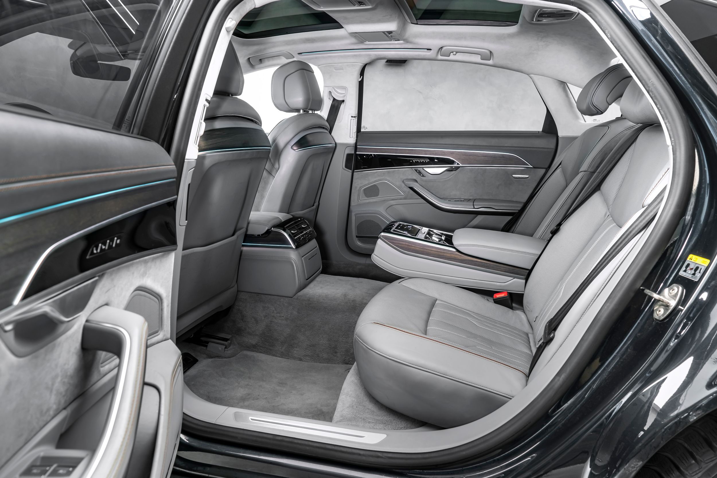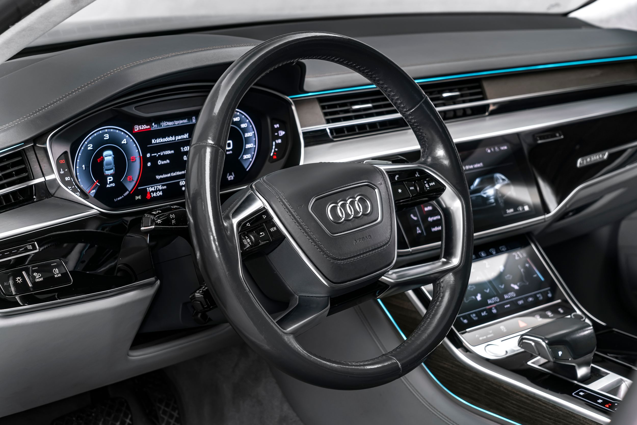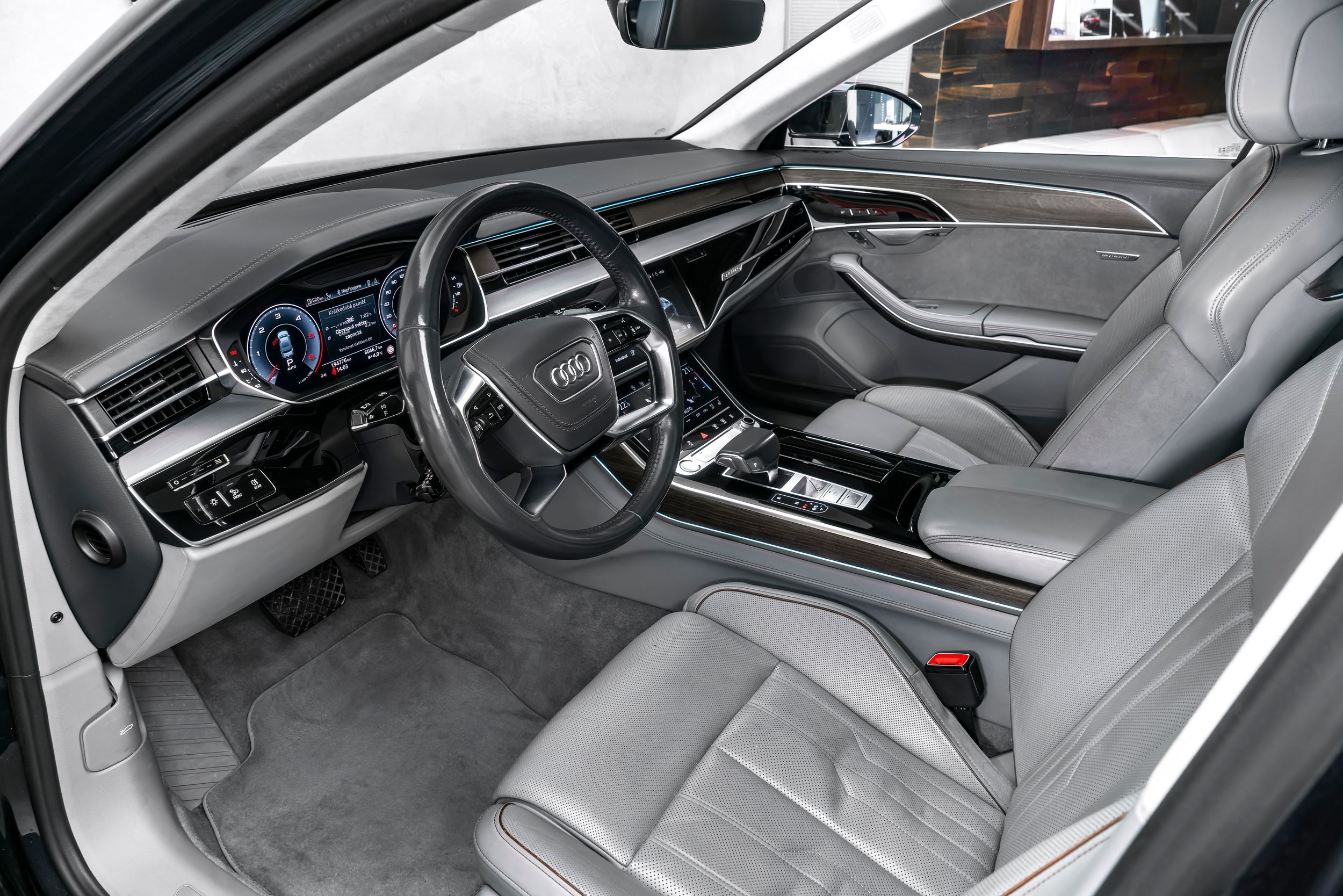 Paket City Assistance, rozhraní Audi music v zadní části vozu, rozhraní Audi Smartphone Interface, paket výbavy: Audi Design Selection, šedá Merino, ovládací prvky s imitací skla včetně rozšířeného hliníkového vzhledu, systém pro nakládání průchozích předmětů (středová loketní opěrka vzadu), dynamické řízení - řízení všech kol, paket zadních sedadel s jednotlivými sedadly (2+1 sedadla), vozidlo bez DVD mechaniky, paket pro zavazadlový prostor, head-up displej, ionizátor pro čištění vzduchu (systém kvality vzduchu), kamerový systém s výhledem do okolí (pohled shora), paket pro konturové/ambientní osvětlení (plus), palivová nádrž: 82 litrů, přídavná čtecí světla v zadní části vozu, litá kola 9x20 (10paprsková, design Y), maticové LED světlomety s laserovým světlem, panoramatické střešní okno, elektrické ovládání vpředu, pevné vzadu, perleťový lak, dálkové ovládání zadních sedadel (centrální jednotka vzadu), rezervní kolo jako nouzové kolo, integrovaný vysílač otevírání garážových vrat, elektrické zavírání dveří, bezpečnostní paket, ventilace a masážní funkce vpředu a vzadu, audiosystém Bang & Olufsen, paket pro sportovní exteriér, nezávislé topení, zásuvka 230 V, telefon vzadu bez bezdrátového nabíjení (Audi Phone Box), digitální televizní příjem (tuner) a digitální rádiový příjem, tónovaná zadní okna (zatmavená skla) a akustická skla předních dveří, zvedák, komfortní paket pro teplé a chladné vozy vpředu a vzadu, tepelně izolační sklo (izolační sklo), tepelně izolační sklo s vyhřívaným čelním sklem (izolační sklo).